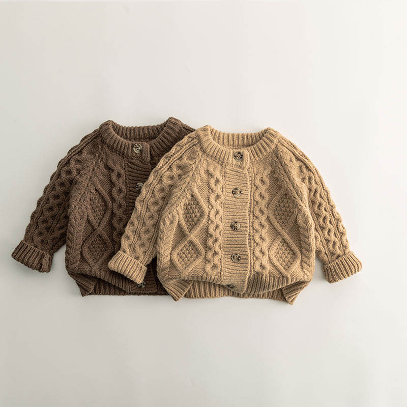 The classic button-closure design makes it easy to put on and take off, while the knitted pattern adds a cozy, timeless charm suitable for both casual outings and indoor wear. Whether layered over a romper or paired with winter bottoms, this cardigan is a versatile choice for babies and toddlers during colder months.